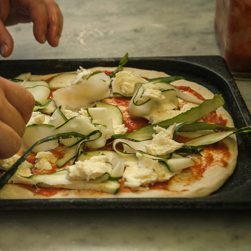 Scelta di: cipolla, melanzane, zucchine, peperone, spinaci, aglio, carciofi, funghi, pomodori, rucola, olive, capperi