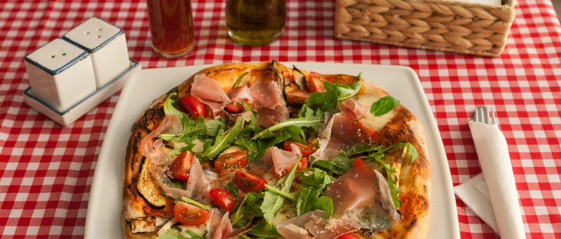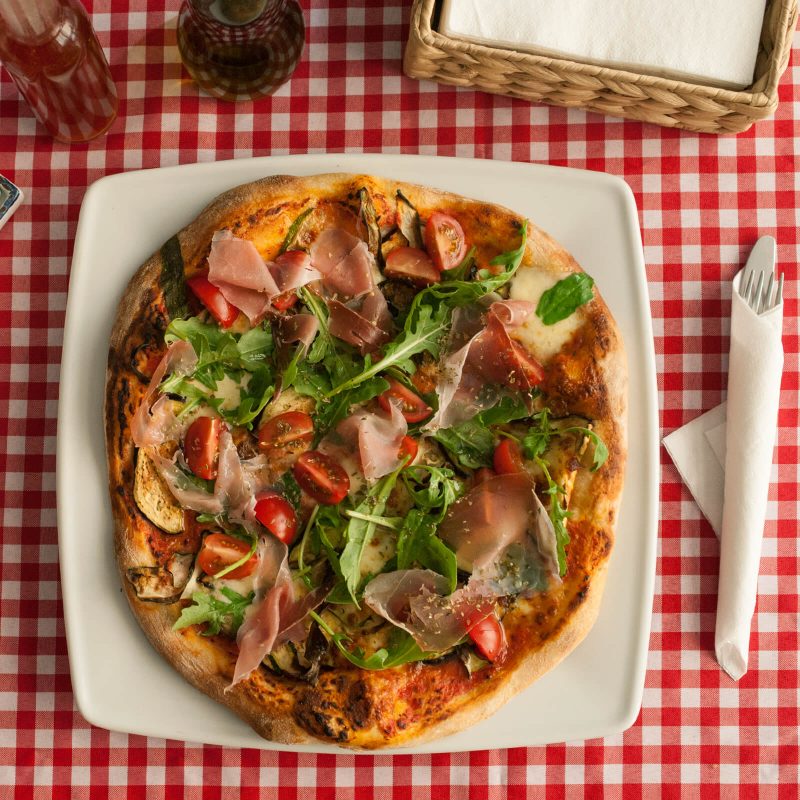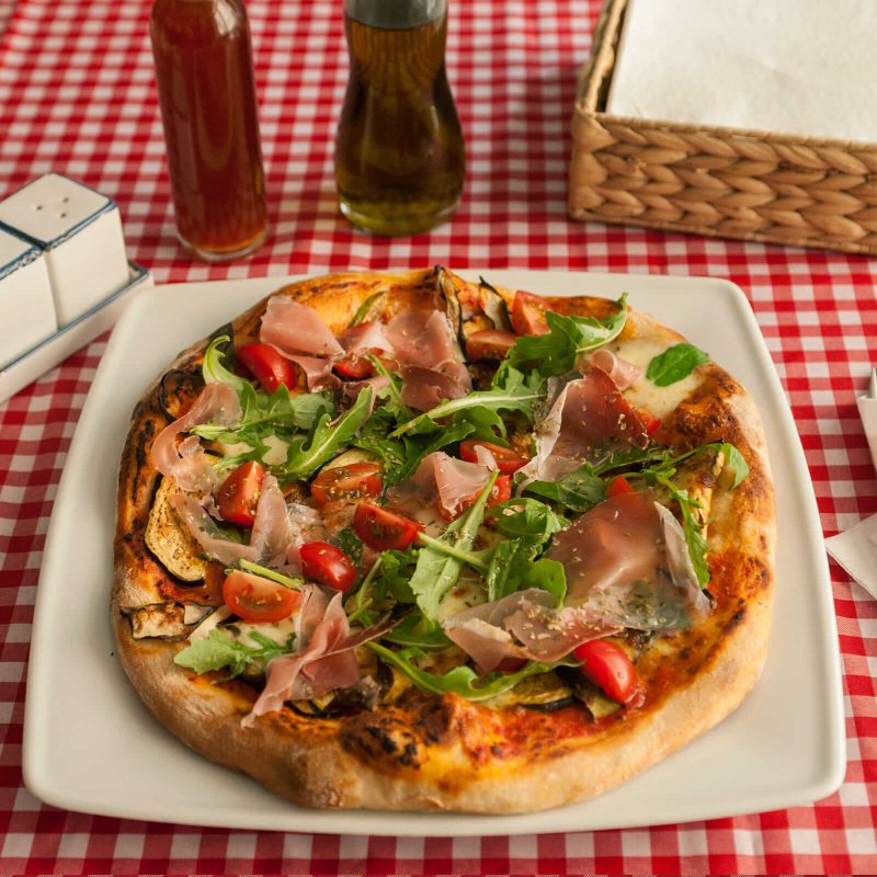Salsa di pomodoro, mozzarella, formaggio affumicato, prosciutto italiano, rucola, parmigiano