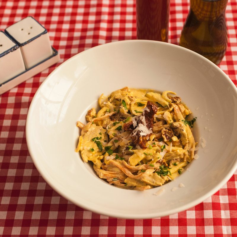 Pasta con pollo al pesto di erbe (rucola, basilico, noci, pollo, panna)